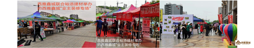 2019年4月28日—5月5日,为庆祝西雅鑫城二期交房,四期新品发售,裕添房产·西雅鑫城联合裕添建材城举办了“西雅鑫城业主装修”专场,呈现了家门口的一条龙家装服务。现场装修品类齐全,优惠空前、礼品丰富,正庆装饰、麦克维尔空调、约克空调、志邦橱柜、国森家居、TATA木门、索菲亚衣柜、欧雅壁纸等30多家装修建材商户齐装上阵,场面 热闹、咨询人员络绎不绝。